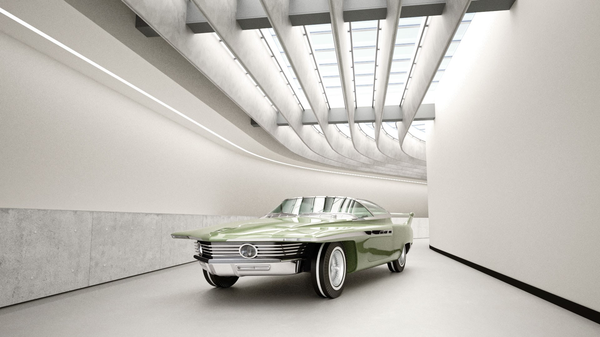 (This CGI case study of the Chrysler Turboflite is meant to study our in house created car texturing system and in this specific case the speed modelling of a museum aswell as incorporating grass and trees)